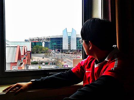 看得到球場的房間是在最高層磚紅色靠馬路的幾間,一層大概有2~3間的視野看得到OT